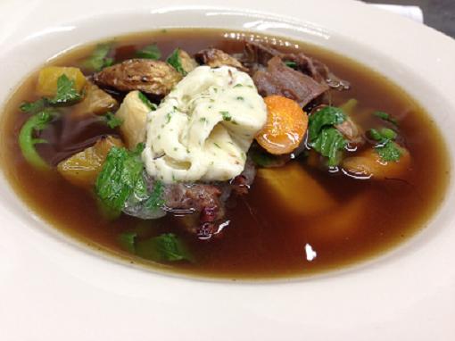 Rich beef neck broth and shredded meat, with root vegetables, hearty greens and a chervil-marrow butter.