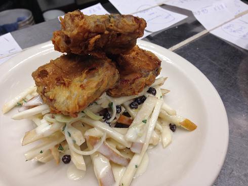 Crispy pork tongue served on a salad of winter pears, leeks, celery root and black currants with a creamy leek vinaigrette.