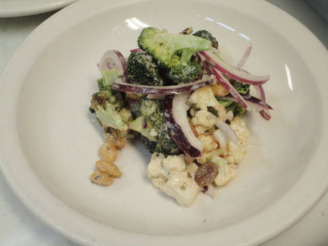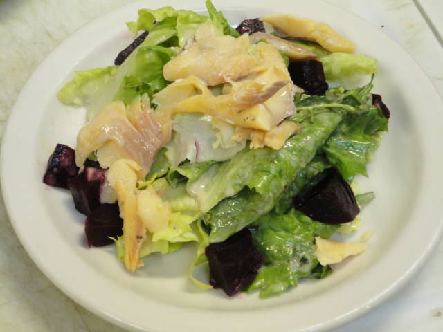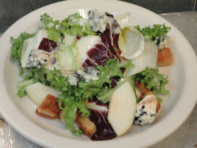 Salad of curly, Belgian and red endives, with creamy bleu cheese dressing and garlic croutons.