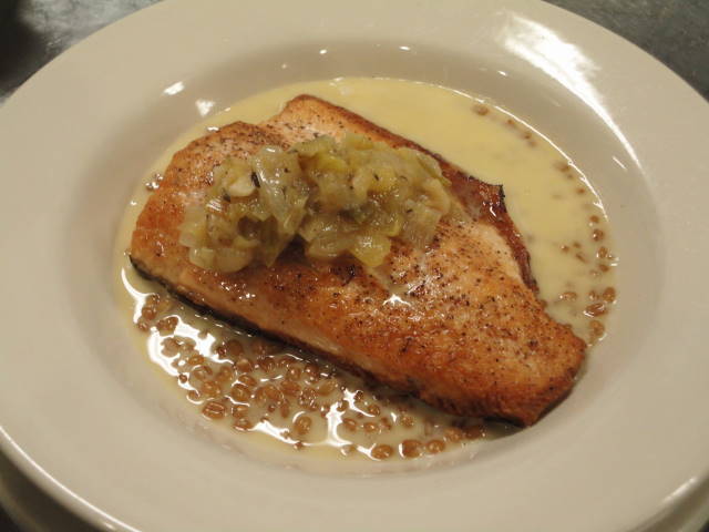 Lummi Island pink salmon with wheat berries, creamy cider fumet and apple-leek-thyme compote.