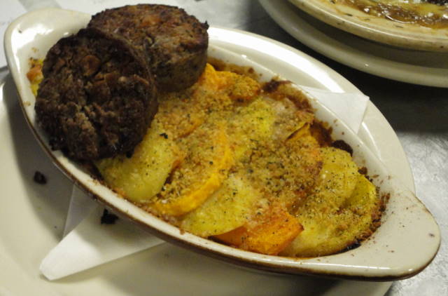 Penn Cove mussels simmered with toasted garlic, sweet onions, parsley and a creamy saffron fumet.Onions soup country bread crouton and crusty comte cheese.Salad of roasted cauliflower and broccoli, red onions, sultanas and a creamy herb vinaigrette, served with our cold half chicken.Whtie bean and roasted garlic soup garnished with dried fig-rosemary chevre.House smoked trout served on a salad of escarole, roasted beets, tarragon, walnuts and a walnut vinaigrette.Starter sized steak tartare served with tomato-sweet pepper-fennel-nicoise olive compote and grilled baguette.Gratin of potatoes, winter squash, creamy apple puree and sheep’s milk cheese bread crumbs, alone or with pan roasted house made pork sausage.Caramelized rice cake served with candied pumpkin and currents and fresh cream.Walnut-apple cake served with calvados and spice creme fraiche.Chocolate mousse served with fresh whipped cream and a vanilla sable cookie.