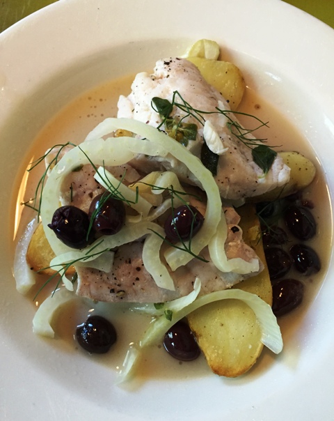 Fish of the day poached with fennel, Nicoise olives, white wine, lemon and fish broth, served with grilled fingerling potatoes.