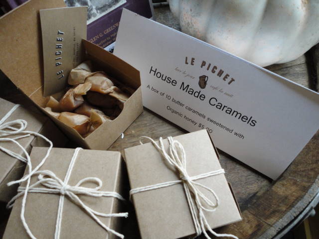 Here at Le Pichet for the Holidays, we are wrapping up gift boxes of our famous salted butter caramels for you to enjoy or to give. Made with only organic honey, heavy cream, butter and sea salt, each box holds 10 caramels and are $5 while the supply lasts.