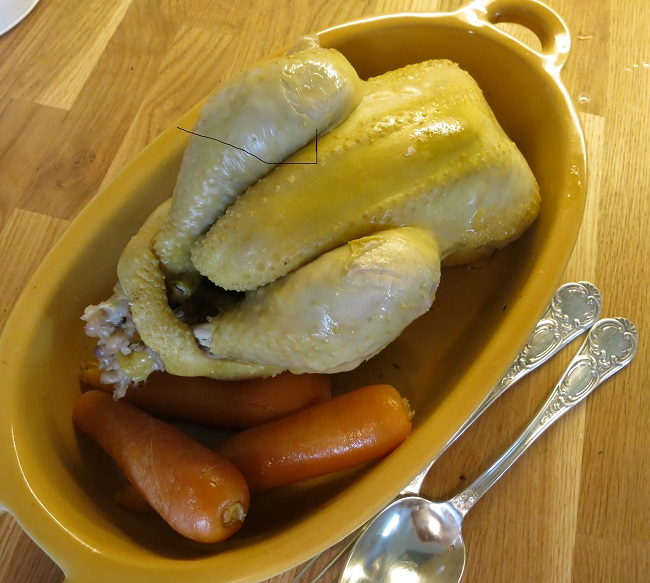 Back in Orthez and returning to the real world, dinner is nothing like so fancy. Just a farm chicken, its fat golden yellow from its diet of corn and garden bugs, poached with carrots. A earthy dinner that also has the side benefit of creating a lot of rich yellow chicken broth to use later.