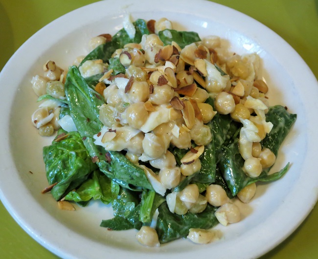 Salad of salt cod, marinated chickpeas, golden raisins, spinach and almonds, with a pastis vinaigrette.