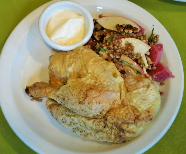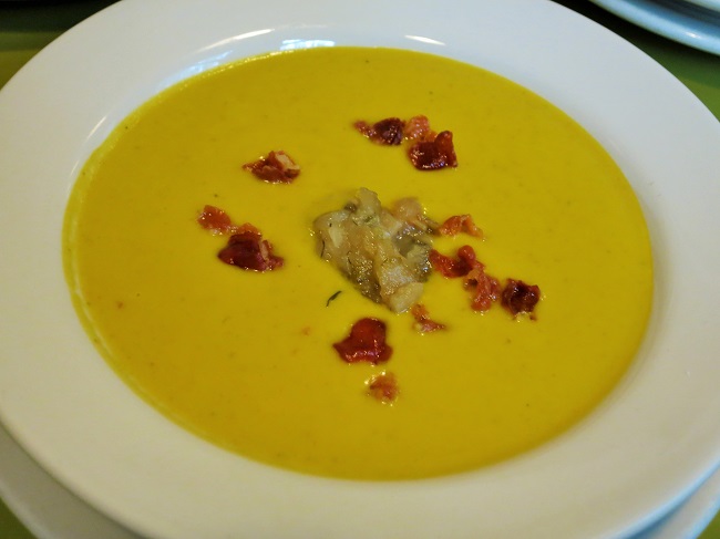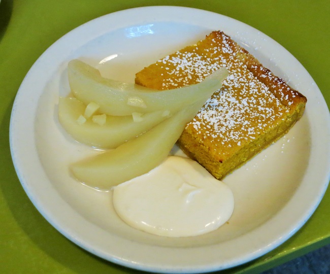 Roasted pumpkin and fennel soup, garnished with pear-fennel compote and crispy Serrano ham.Cold roasted free range Washington half chicken, mayonnaise and a salad of hard spring red wheat berries, roasted beets, walnut, apples and a cider-tarragon vinaigrette.Cauliflower, caramelized shallots baked with sage cream and comte cheese, with garlic grilled King oyster mushroom.Penn cove mussels simmered with white wine and basque-style sweet pepper ragout with panchette, tomatoes, garlic, onion and pimente d’Espelette, served with grilled baguette.Petit grass fed beef strip steak steak, with brandied current cream sauce, wilted spinach and pommes frites.Spiced chocolate frozen terrine served with fresh whipped cream and caramel sauce.Warm apple-almond galette served with black currant-calvados ice cream.Dense pumpkin cake, served warm with ginger poached pears and brown sugar creme fraiche.