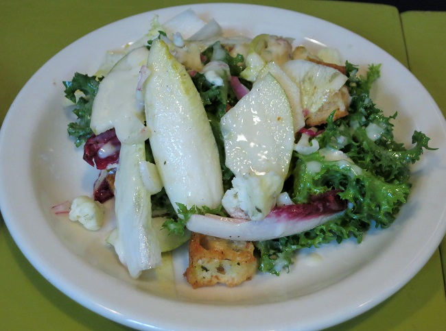Salade of red, Belgian and curly endives and pears with creamy Bleu d’Auvergne dressing and garlic croutons.