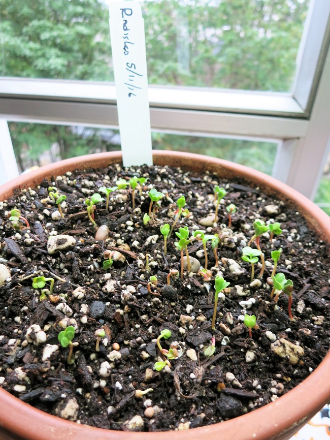 Radish sprouts in the east-facing window of my apartment. These radishes are the second crop this year from this pot: the first was a crop of collard greens that just about made a side dish for two. Obviously my garden is more symbolic than practical.
