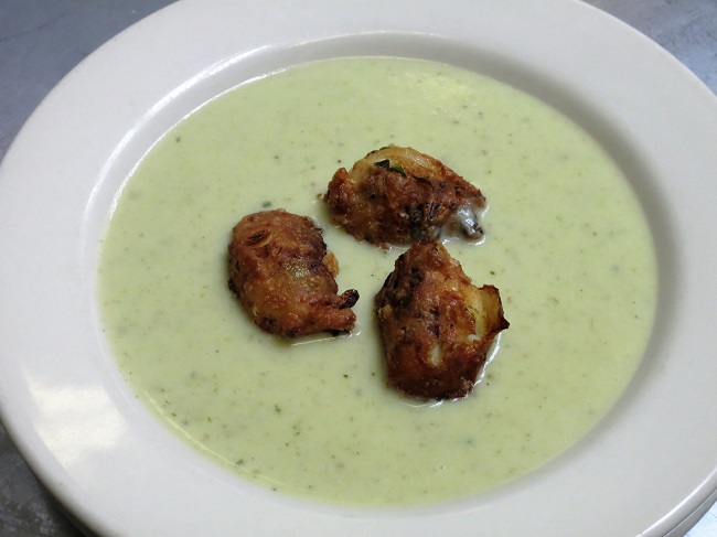 Today’s special at Café Presse combines lovage from our own garden with morel mushrooms: Creamy potato-leek-lovage soup garnished with morel mushroom and Comté beignets