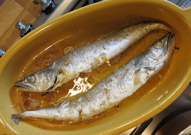 It s a mild, firm, flaky white fish in the same family as cod, though maybe a bit firmer. It is a fish that can be cooked just about anyway you can think of, but broiling or roasting work especially well. For this dish, I just mixed sliced garlic and diced shallots with sea salt, piment d’Espelette and olive oil, then drizzled this over the fish and broiled. For small fishes like these, the cooking takes about 4-5 minutes per side.