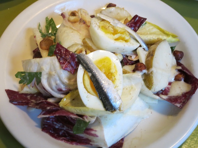 Salad of radicchio and Belgian endive, winter pears, hard cooked egg and vinegar cured anchovies.