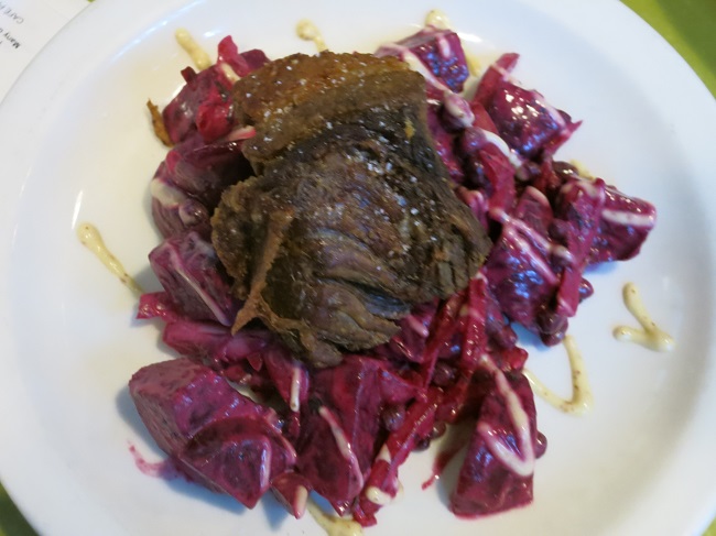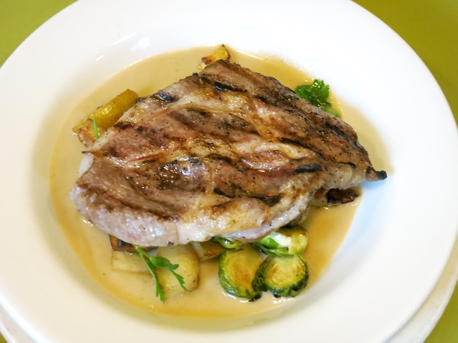 Spice brined pork collar, grilled and served on a saute of root vegetables, Brussels sprouts, winter pears and parsley, with roasted pear-garlic puree.