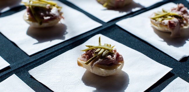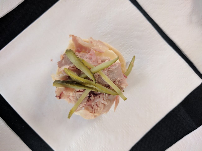 For their cocktail hour hors d’ouevre offering, Café Presse chef de cuisine Patrick MacWhorter and Le Pichet chef de cuisine Dave Cooper chose a mini-version of the classic Parisian sandwich, the jambon-beurre. The ultimate in simplicity, the jambon-beurre consists only of good bread, salted butter and jambon de Paris. Their version featured house-made Paris-style ham, sea-salt butter from Brittany, house made brioche and a garnish of cornichons.