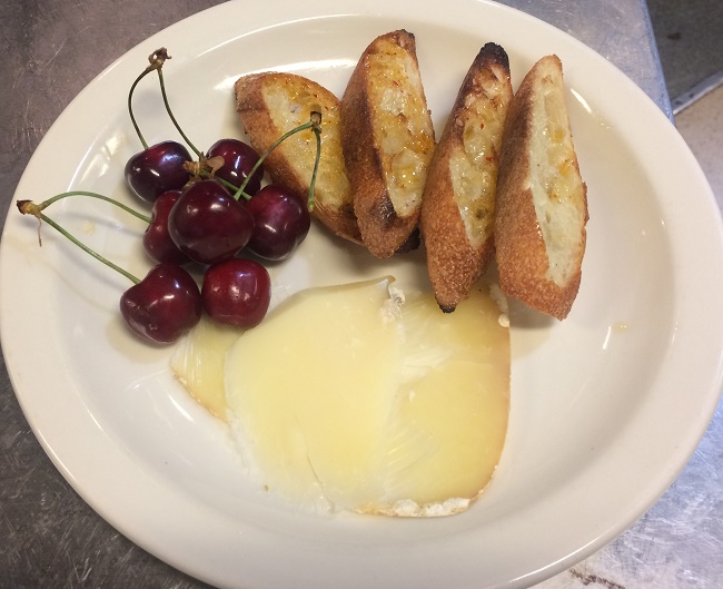 First of the season Burlat cherries, with Brebis de Pyrenees sheep’s milk cheese and piment d’Espelette grilled baguette slices.