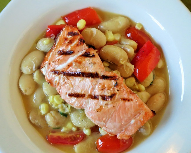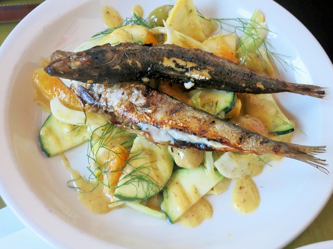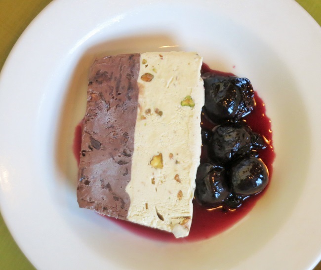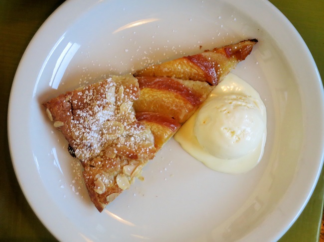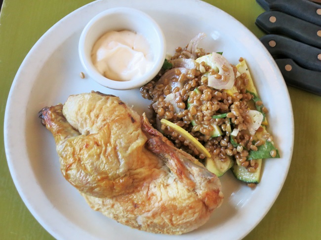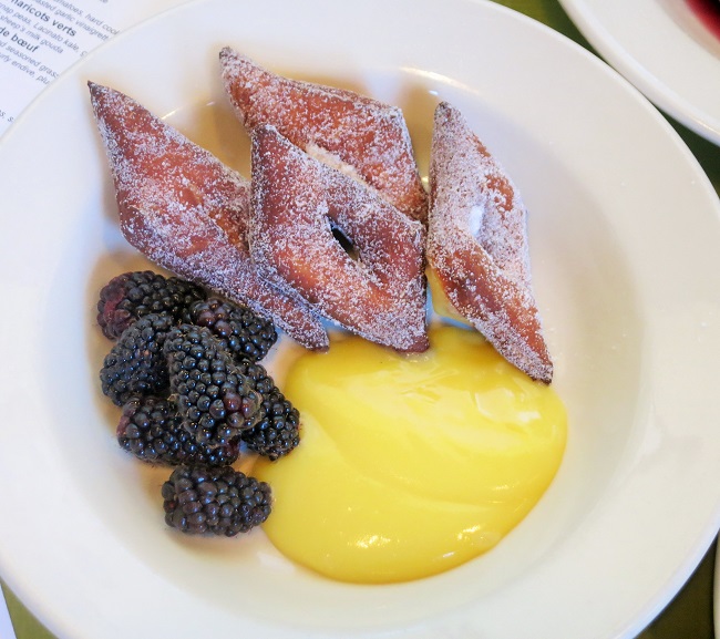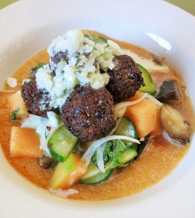 Salad of green beans, snap peas, kale, garlic croutons, lemon vinaigrette and aged sheep’s milk tomeCrispy pork belly confit served on a ragout of French lentils finished with persillade butterSweet corn-potato-gruyere soup with marinated shiitake mudrooms and sage pistouCrispy falafels with spicy melon puree, cucumber, grilled eggplant, mint, Walla Walla onions and sauce blancheCold half roasted chicken served with mayonnaise and a salad of wheat berries, lovage leaves, summer squashes, shallots and lovage vinaigrettePacific sardines grilled, served on a salad of fennel, zuchini, oranges, picholine olives and sumac vinaigretteWild caught salmon filet, smoked then grilled, on white beans simmered with cherry tomatoes, roasted red peppers, corn, basil and a sweet corn fumetToulouse style sausage served on creamy polenta with green onions and goat’s milk cheese, rich pork jus and Bing cherry-sweet onion compoteRustic peach-almond tart served with bay leaf ice creamChocolate-pistachio ice cream terrine served with Bing cherry compoteLemon and orange scented brioche beignets served with lemon curd and seasonal berries