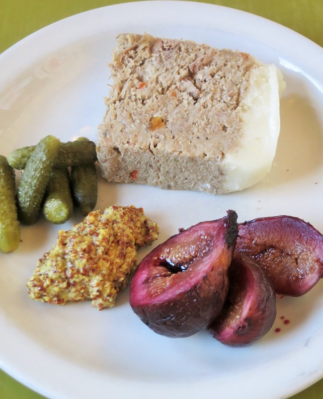 Duck rillettes served wtih red wine poached figs, grain mustard and cornichons