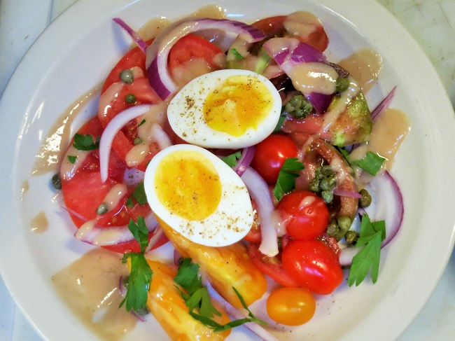 Salad of beefsteak and heirloom tomatoes, red onion, capers, parsley, roasted garlic vinaigrette and a hard cooked egg.