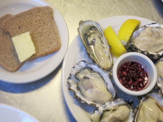 Local oysters on that half shell “a la Breton” with lemon, sauce mignonette, house rye bread and Breton sea salt butter.