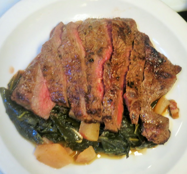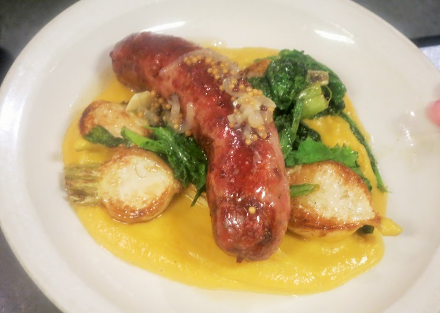 House-made duck-pork sausage served on winter squash-chestnut puree, roasted turnips and turnip greens with shallot-mustard seed duck fat.