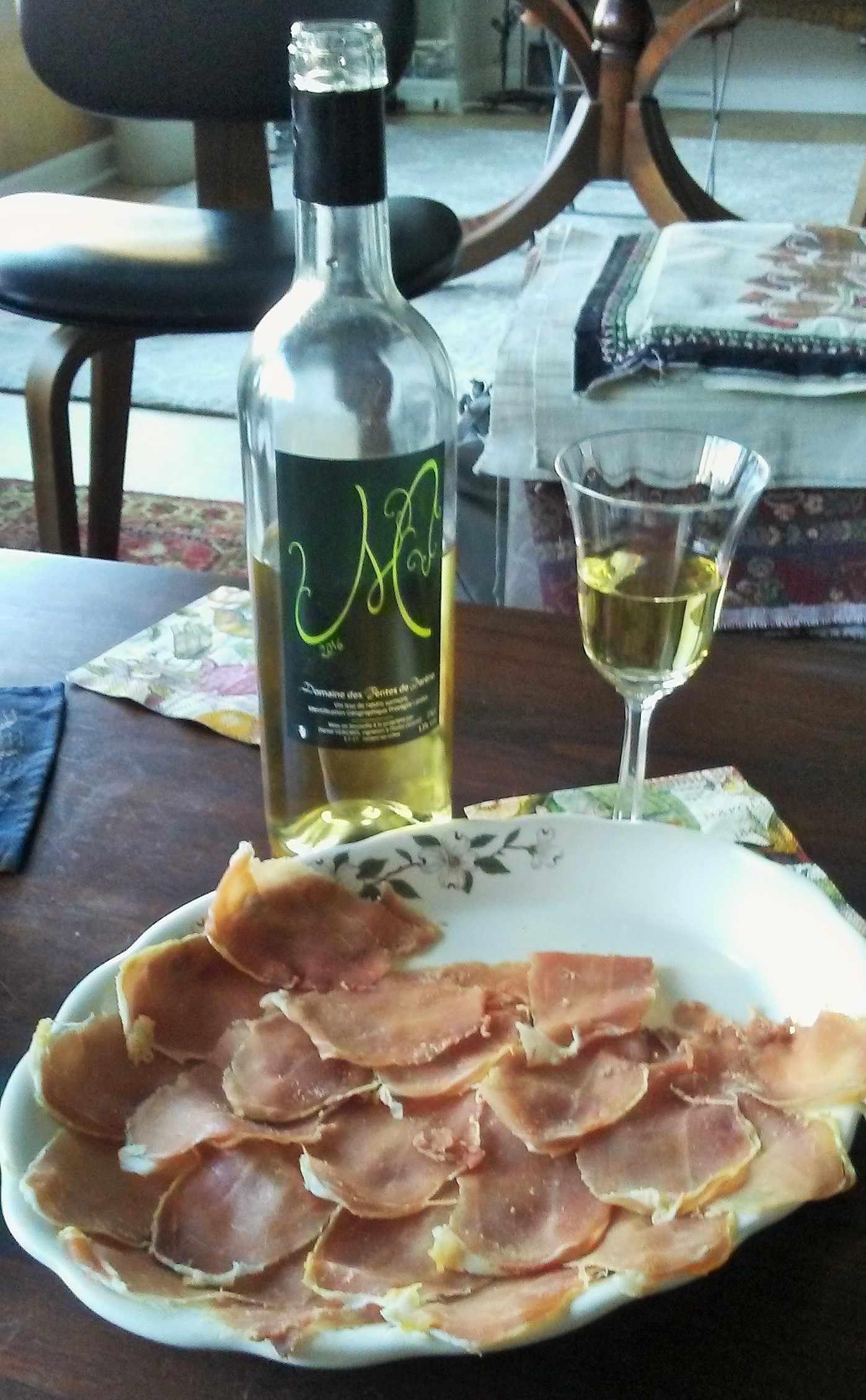 Madame Vergnes recommended that this wine not be tasted before August of 2017, so we obediently resisted the temptation to crack it open until this month. We had our first taste in the company of a platter of the Jambon de Bayonne, the iconic ham from the SW of France. Délicieux!