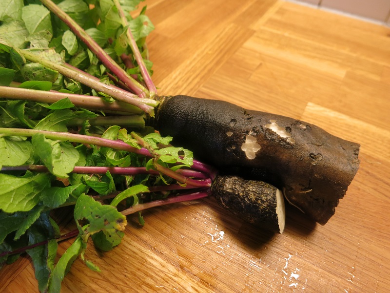 On arrival in late November, found the garden still held a few winter veggies…some sad looking Brussels sprout, a fine row of leeks, one or two gigantic cabbages and a whole bed of black radishes fully 2 inches around and nearly a foot long. The radishes we have planted under a sheet of spring mulch mainly for their ability to break up our clay-heavy soil. Despite their size, the radishes were still firm and peppery. Had the greens sauteed with garlic the first night with a nice confit de canard and the radishes in green salad ever since.
