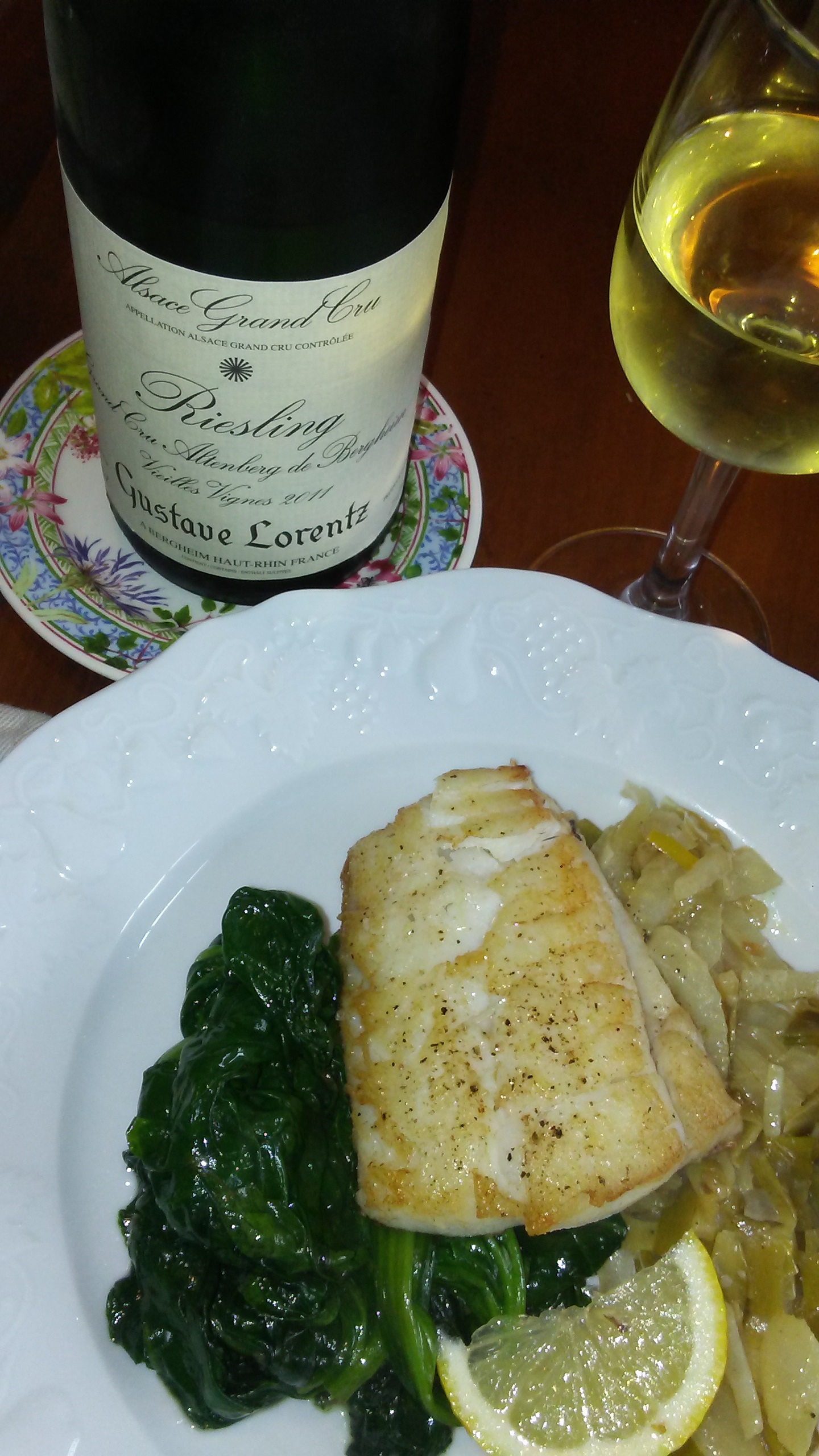 Light supper in Orthez…Merlu de ligne from Saint-Jean de Luz pan sautéed with a compote of fennel and leeks from the garden and sauteed spinach.