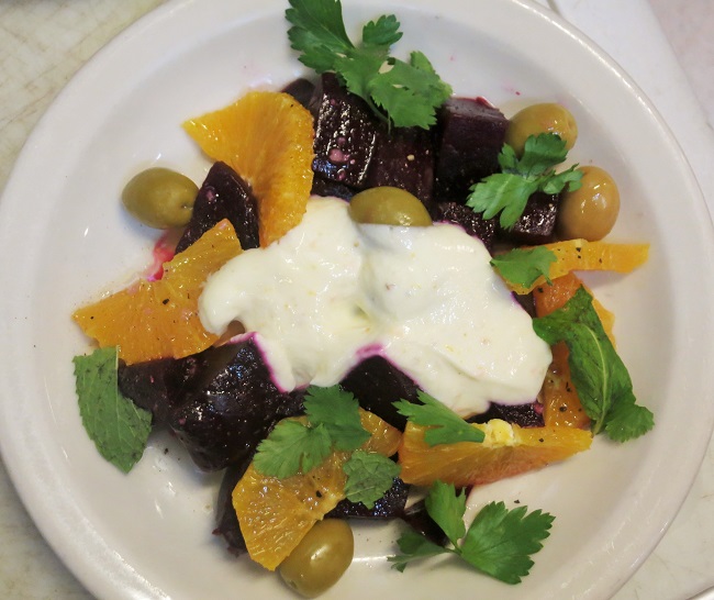 Moroccan-style beet salad with orange slices, picholine olives, parsley, mint, cilantro, olive oil, red wine vinegar and citrus-fennel pollen yogurt