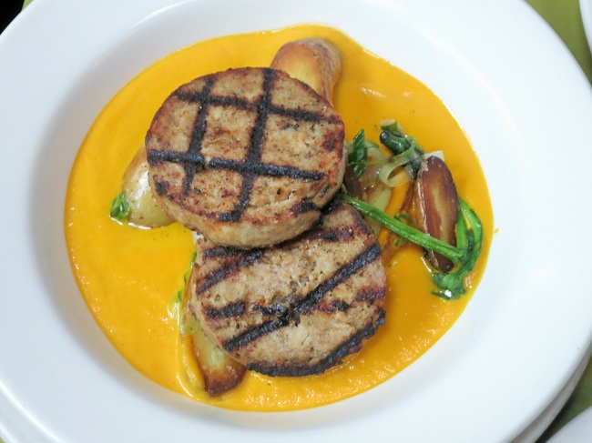 Grilled rabbit-pork boudin sausage served on a sauté of fingerling potatoes, Walla Walla onions and spinach and butter-roasted carrot purée