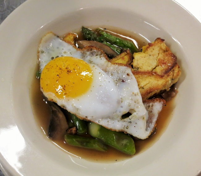 Cauliflower bread pudding, pan roasted and served on a portabello mushroom-asparagus-green garlic ragout with a fried duck egg
