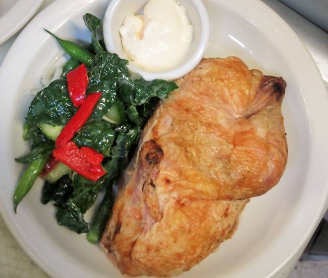 Half free-range WA chicken served cold with mayonaise and a salad of onion-cucumber pickles, kale, green beans, red peppers and black pepper vinaigrette