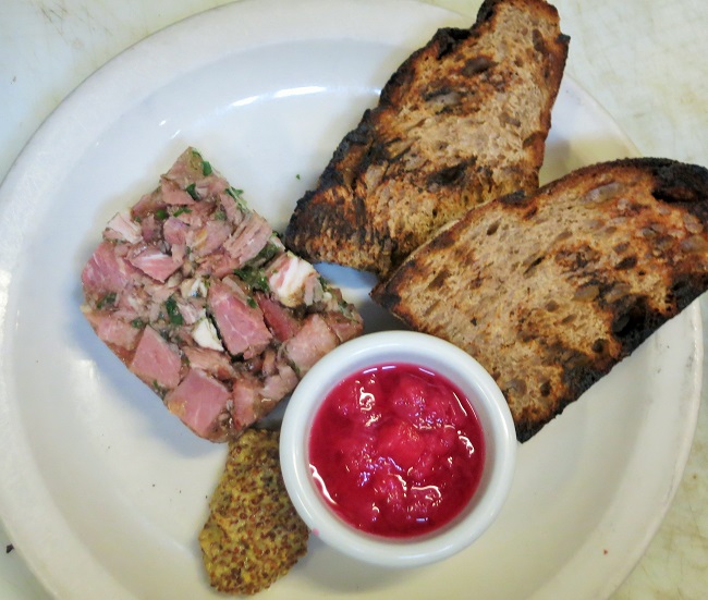 Burgundy-stye smoked ham terrine served with grain mustard, rhubarb compote and grilled country bread