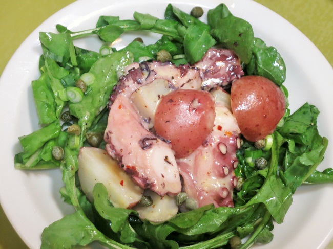 Octopus in the style of the Camargue, served warm tossed with aioli, red potatoes, capers and red chili flake, on a bed of arugula and green onions