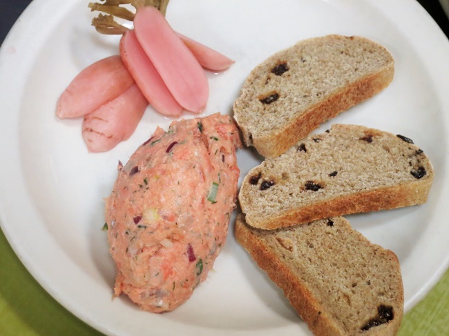 Salmon-smoked salmon rillettes with house-made rye-black currant baguette and fermented radishes