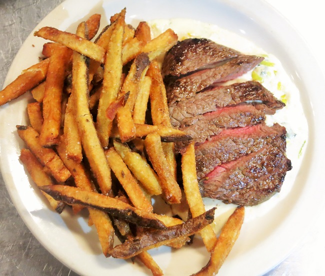 Petit sirloin steak frites served with a creamy leek and blue cheese sauce
