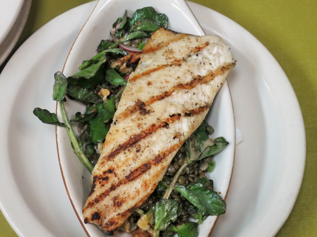 Grilled Idaho trout filet served on a salad of French green lentils, radishes, watercress, walnuts, scallions and walnut-sherry vinaigrette