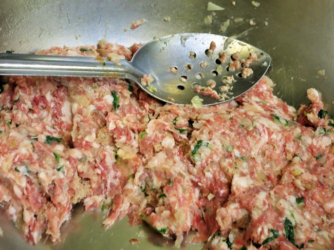 The traditional stuffing for a Poule au Pot is a mixture of ground pork and bread. For my version, I added ground bacon, spinach and thyme.