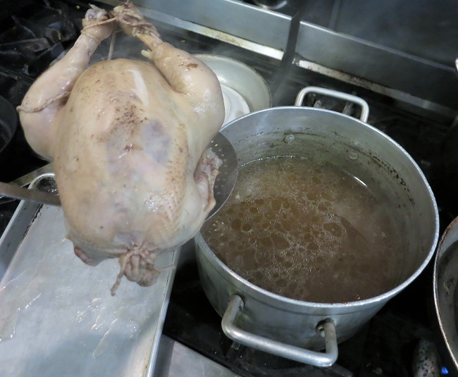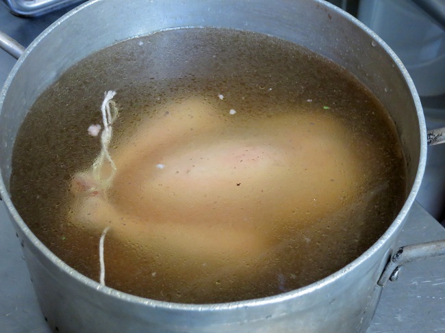 The stuffed chicken goes into a pot of chicken broth to poach gently for about 90 minutes.