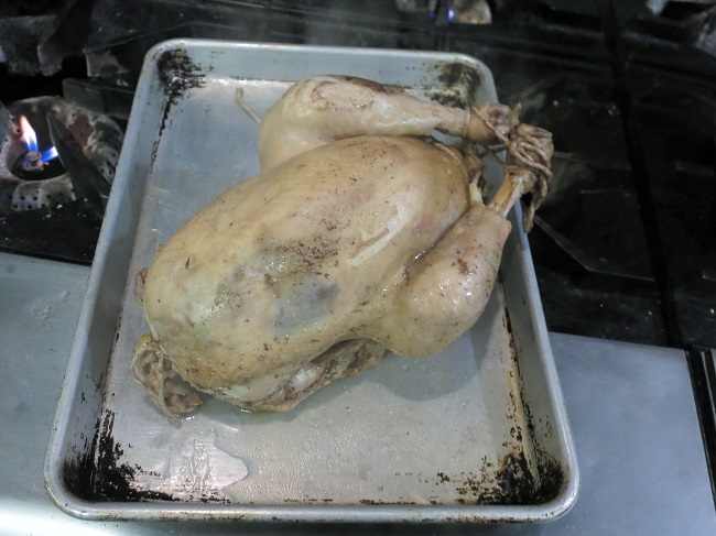 Here is the chicken as received from Hungry Hollow Farms and delivered by owner/farmer Grant Jones. GMO free, pasture raised and left free to hunt lots of bugs and worms, these birds develop a different body shape than intensively farmed chickens: the breast is smaller, the legs larger and firmer and overall there is less fat. The smell and flavor of the flesh is much earthier, slightly gamey, just plain more chicken-y. They remind me quite a lot of poulet fermier that we buy at the weekly farmer’s market in Orthez.