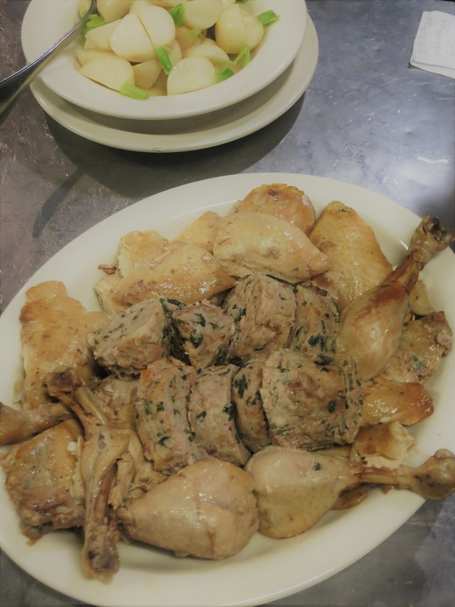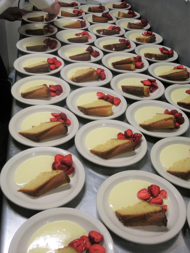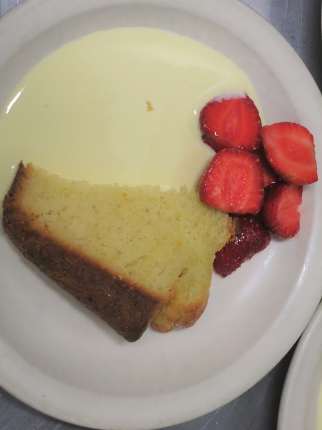 Le vrai poule au pot Henri IV: farm chicken stuffed with bread-sausage stuffing served and poached, served with baby turnips and sauce verteFor the salad course, bitter greens tossed with Bing cherries and piment d’Espelette vinaigrette. This salad was to accompany sheep’s milk cheese from the Val d’AspePlating the dessert course, Pastis LandaisRich brioche cake scented with orange, rum and vanilla, served with Armagnac crème anglais and local strawberries