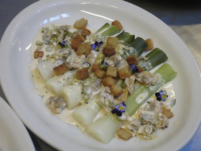 Leeks vinaigrette: cold poached leeks served with Penn Cove clams marinated with thyme and green garlic, shellfish vinagrette and butter fried croutons