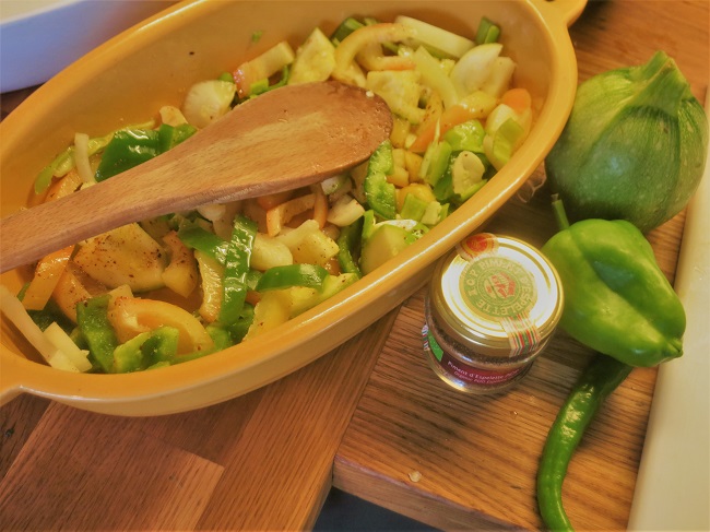Rule 1: Make a flavorful bed of veggies to go under the fish. These will flavor the fish during cooking and will be served as a side dish. I had on hand peppers (both sweet peppers and the famous poivrons longs verts which are the ones the Basques prefer for making piperade) as well as some summer squashes, onions and garlic. Don’t forget to season the veggies with salt and pepper; I used a little piment d’Espelette. Also add a little liquid to the dish to prevent it scorching. Water is fine, but white wine, fish stock, even cider or beer will work well.
