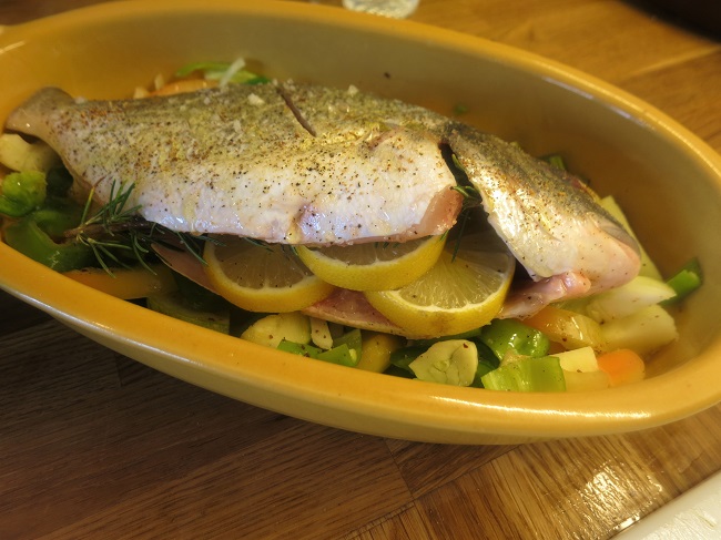 Rule 2: Rub the fish inside and out with olive oil, the season it well with salt and pepper. Fill the cavity with things that will taste well with the veggies you have selected for underneath. I used rosemary from the garden and lemon slices.