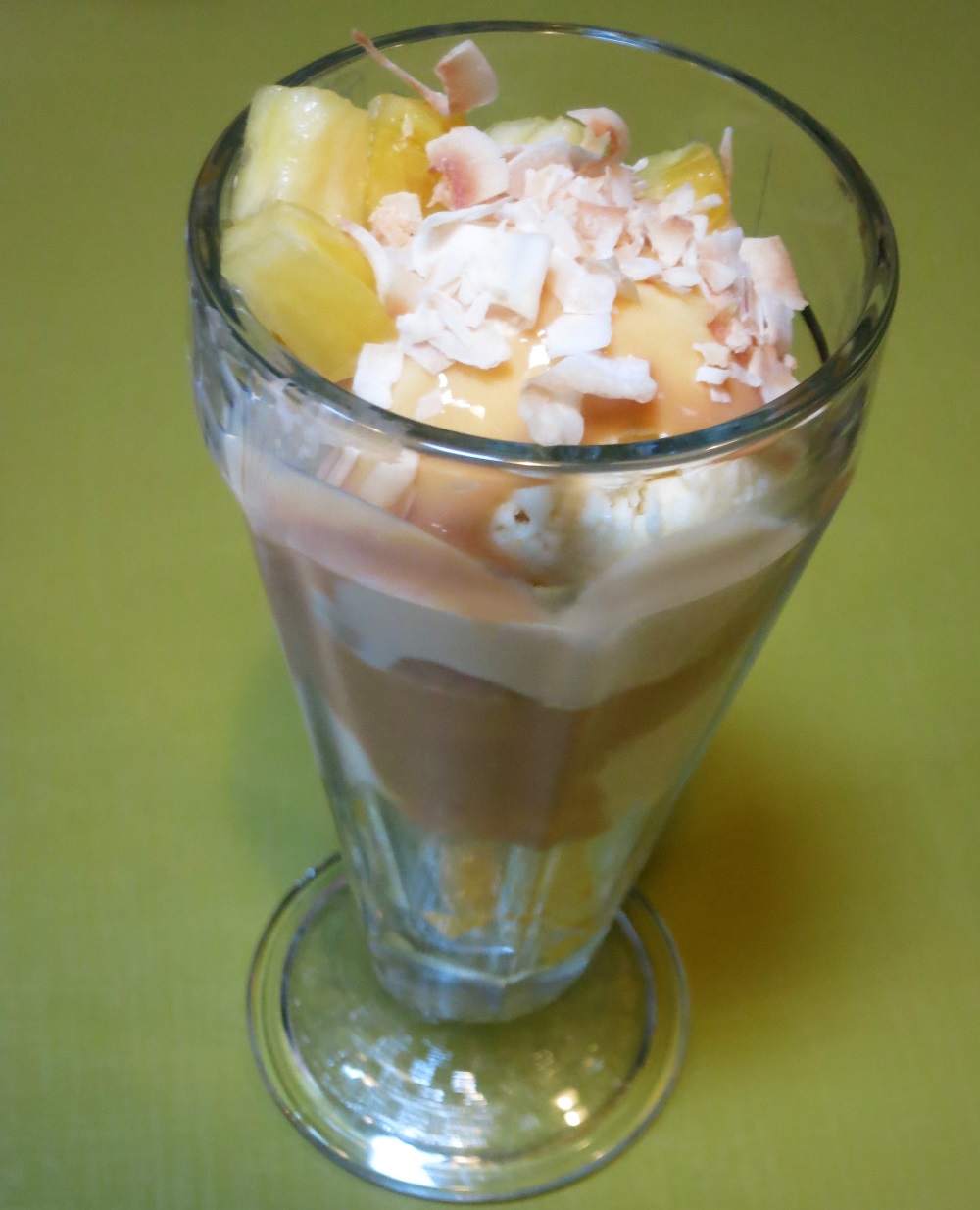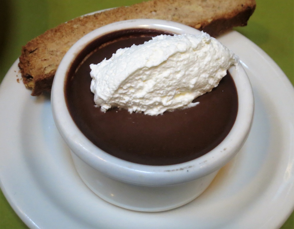 Chocolate-espresso pots de creme served with whipped cream and hazelnut biscottiOur Coupe Glacée for winter features toasted coconut ice cream, tropical fruits, rum confiture de lait and toasted coconut flakes