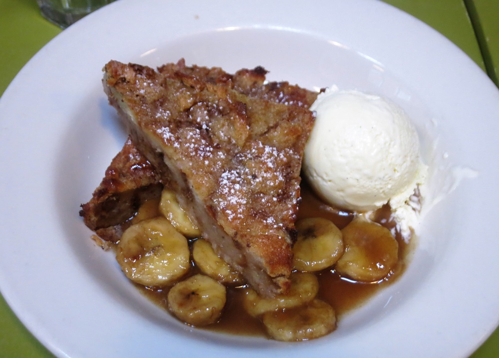 Vanilla-walnut bread pudding, served warm with caramelized bananas and vanilla ice cream