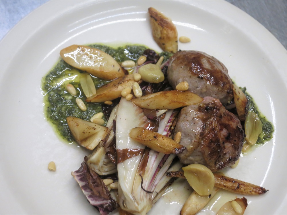 New for spring on the menu at Le Pichet: Rustic Lamb-pork caulfat sausages, pan roasted and served on roasted radicchio, salsify, garlic confit, pine nuts and nettle-herb pistou