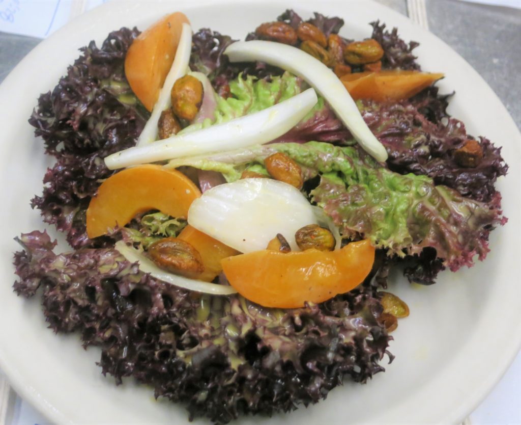 Salad of lolla rossa lettuce, marinated apricots, Walla Walla sweet onions, roasted apricot vinaigrette and candied pistachios
