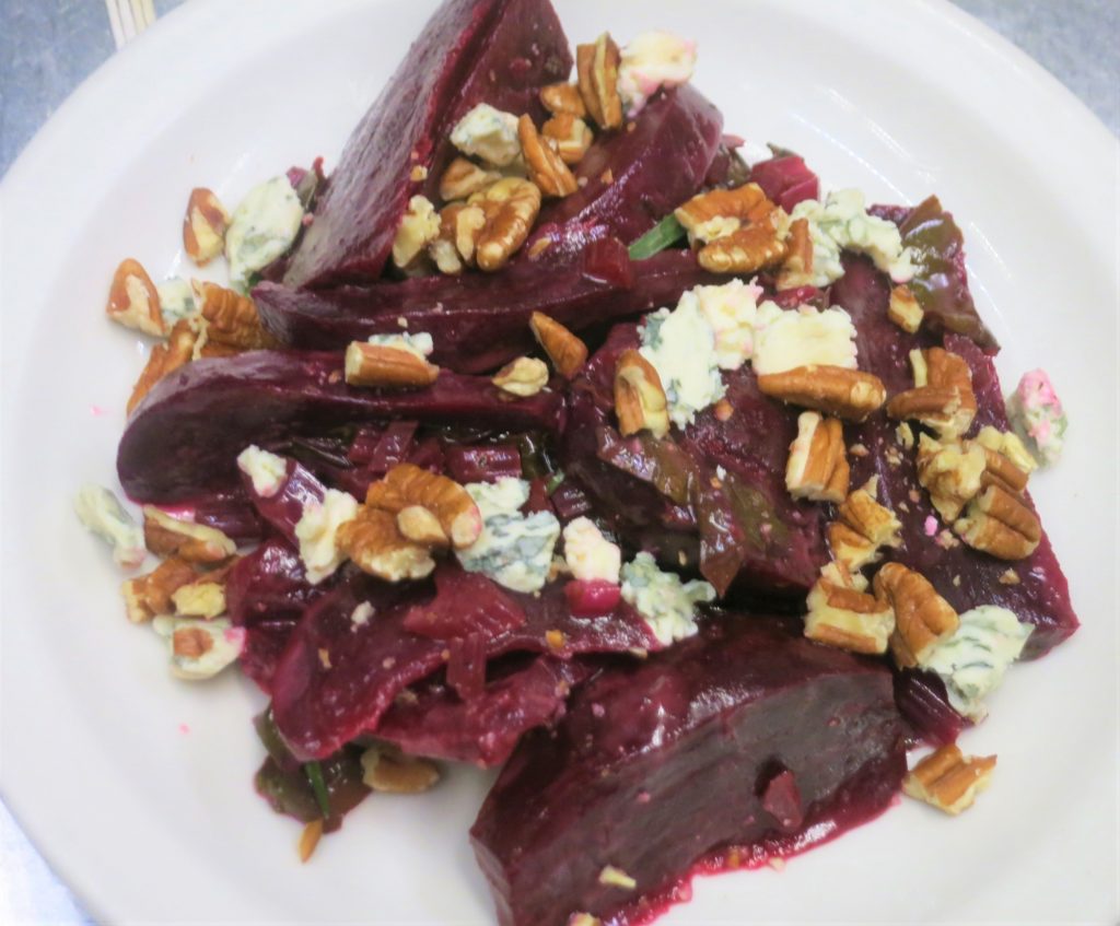 Roasted red beets and marinated beet greens, with tarragon vinaigrette, toasted pecans and cow’s milk bleu cheese