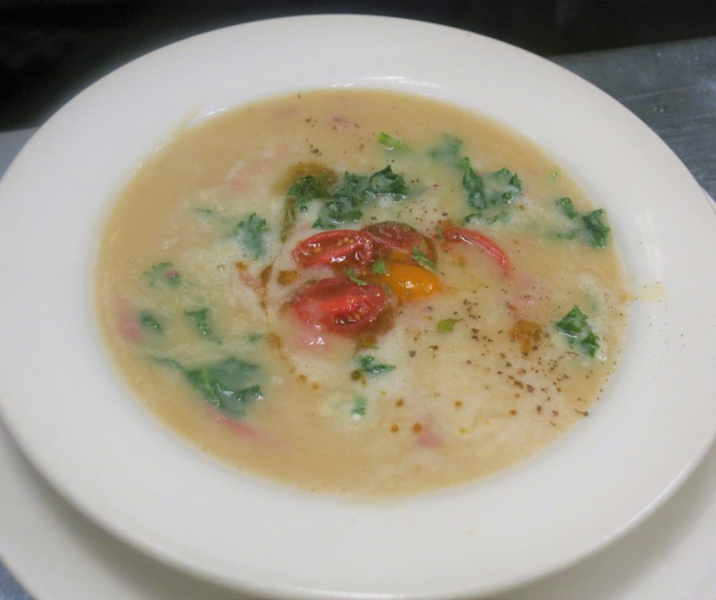 Pureed white bean soup with onions, garlic, smoked ham hock and kale, garnished with marinated cherry tomatoes and parsley