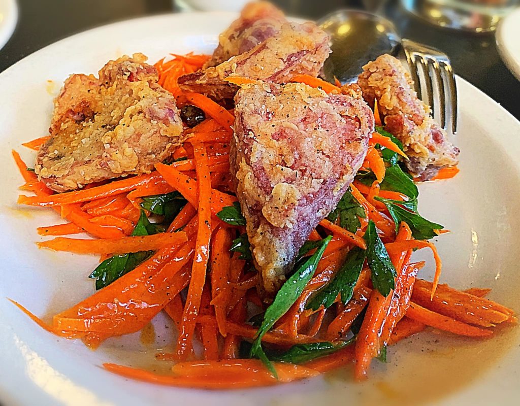 Le Pichet New on the menu at Le Pichet Posted on October 20, 2019 By Jim An old favorite returns to the menu at Le Pichet for Fall: Crispy buttermilk-fried pork tongue served on a salad of raw carrots, parsley, black currants and cumin-sherry vinaigrette Miam Miam! Tagged Charcuterie, Fall, New Menu, salads