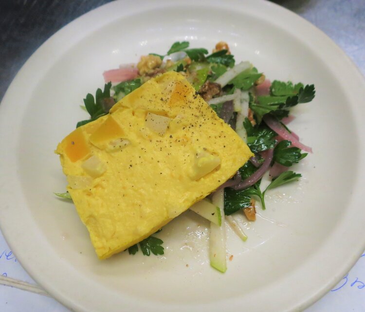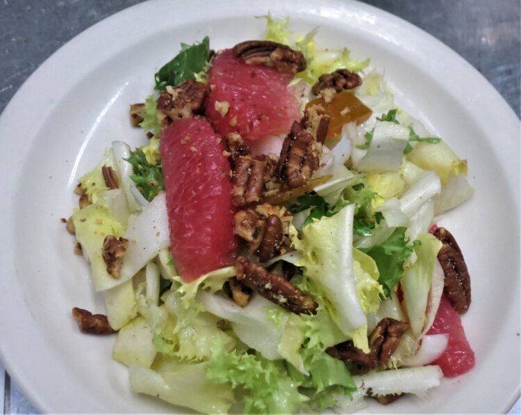 Salad of curly endive, grapefruit supremes, candied grapefruit peel, pecans and grapefruit vinaigrette Roasted squash-onion-pear terrine, served cold with a salad of walnuts, parsley, cow’s milk bleu cheese, pickled onions and pears